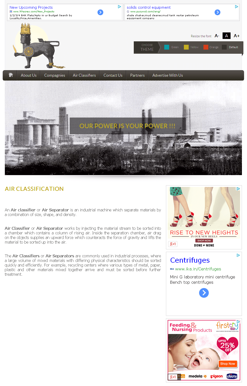 Airclassification.com is a website that aims to provide information that will enable the users to choose the most suitable Air Classifier & Air Separator for their projects from the market leaders. The website is having the multi-color theme and is easy to navigate. The UI was created with HTML (div), CSS, jQuery and the website is in web 2.0 style - clean in it's look and feel. The site overall can be managed from the The admin of the site can manage website menu, page content, advertisements from the backend. Additionally, we have added functionalities like menu reorder, image rotation, Google Ads etc.