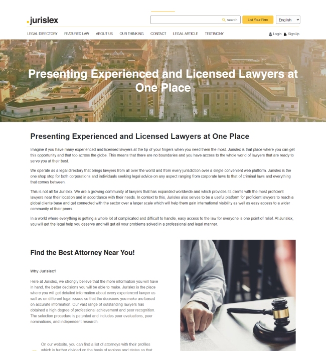 Jurislex provides a platform for lawyers and clients to meet at one place. Through Jurislex, clients looking for legal assistance can easily get in touch with proficient lawyers from all over the world. This in turn also provides a global exposure to experienced lawyers. On Jurislex’s website, individuals or businesses in the need lawyers can find complete details about the registered lawyers and law firms and make an informed decision related to their legal requirements.