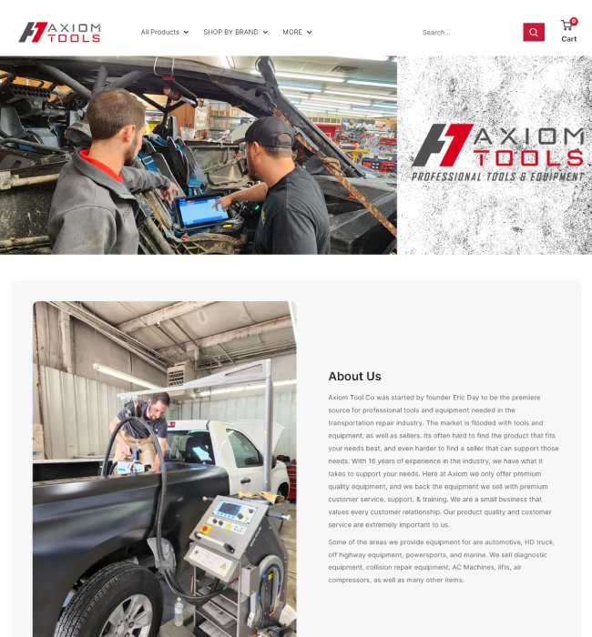 Axiom Tools is a US-based e-commerce retailer offering premium professional tools and equipment needed in the transportation repair industry. They are known for providing excellent quality equipment coupled with exceptional customer service, support, and training, Axiom Tools caters to a wide range of sectors, including automotive, heavy-duty trucks, off-highway equipment, Powersports, and marine. Their diverse product portfolio includes diagnostic equipment, collision repair equipment, AC machines, lifts, air compressors, etc.