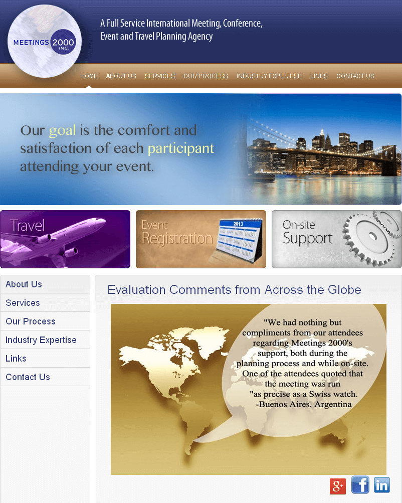 Meetings 2000 wants to be known as a small, boutique international corporate meeting-planning agency. For the website of the business, the client wanted a design that would render a high technology, clean, crisp, contemporary look.