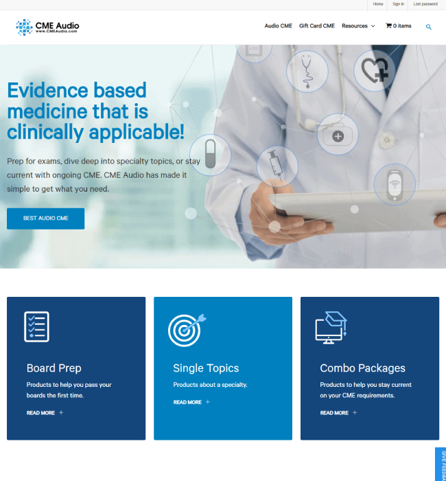 CME Audio approached us to design and develop a website from scratch for selling their on-the-go CME content for clinicians. We designed and developed a robust and secure website for them using WordPress technology. Our development process focused on creating a user-friendly interface that enhances user experience while providing robust backend functionality. The website's architecture ensures smooth navigation and makes it easy for customers to navigate and find the content they need.