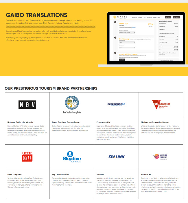 Gaibo Agency is a renowned client that pioneered seizing opportunities within the lucrative Chinese and Indian tourism markets through a suite of services. The Gaibo Agency and Connect2India facilitate travel trade representation, multicultural digital marketing, content creation, and linking tourism brands with multicultural audiences. Gaibo Influencers leverages a network of over 300 local influencers to enhance brand recognition and conversion. Meanwhile, Gaibo Translations offers high-quality translation services in over 20 languages, ensuring effective communication. Together, they provide a comprehensive solution for multicultural marketing, blending influence, reach, and culturally appropriate communication to maximize impact in these dynamic markets. As per client requirements and suggestions, we designed the website on WordPress and made the desired changes.